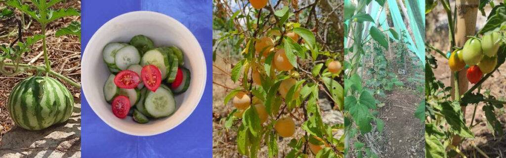 In de vorige Parole vertelden we jullie al over de talrijke fruitbomen en kruiden die verspreid op ons terrein groeien. In mei hebben we op de weekmarkt en bij een tuincentrum allerlei plantjes gekocht voor de moestuin: tomaten, aubergines, komkommer, paprika, sperziebonen, rucola, venkel, meloenen en pompoenen. We zijn heel benieuwd of het allemaal gaat aanslaan in onze moestuin, gaat groeien en bloeien en vruchten geven. Het is voor ons ook experimenteren: we vinden relevante informatie op internet en krijgen tips van onze buren en vrienden. Als het vanaf begin juni erg warm wordt, maakt Hans tentconstructies van bamboestokken en plastic zeil om de jonge plantjes tegen de hete zon te beschermen. Elke avond zijn we een poos zoet met water geven en we zijn trots dat op een enkel plantje na, alles gaat groeien. In juli oogsten we onze eerste tomaatjes, komkommers en rucola. Heerlijk!