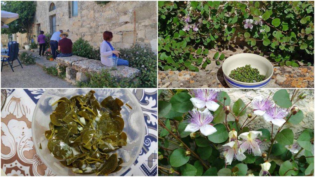 Op onze binnenplaats groeien ook kappertjesplanten. In januari heeft Pauline ze gesnoeid op aanraden van een van de verkopers. Waar het aan ligt, we hebben geen idee, maar nadat we hier sinds april wonen, groeien de planten als een tierelier en er komen ook nieuwe tevoorschijn. In de tweede helft van mei kunnen we voor de eerste keer kappertjes oogsten: de bloemknopjes van de plant, ter grootte van een doperwt. Op Sicilië is het de gewoonte ze in te maken in zout (azijn is een andere optie), we maken een leuk voorraadje en gebruiken de kappertjes in salades en (pasta)sauzen. Buren en vrienden verbazen zich over de vele enorme planten bij ons en komen ook gezellig oogsten. Zo leert Pauline dat je van de nieuwste blaadjes van de plant een heerlijke salade kunt maken, dat moet natuurlijk worden geprobeerd en ja hoor, mmmmm, Sicilianen weten wel wat lekker is!