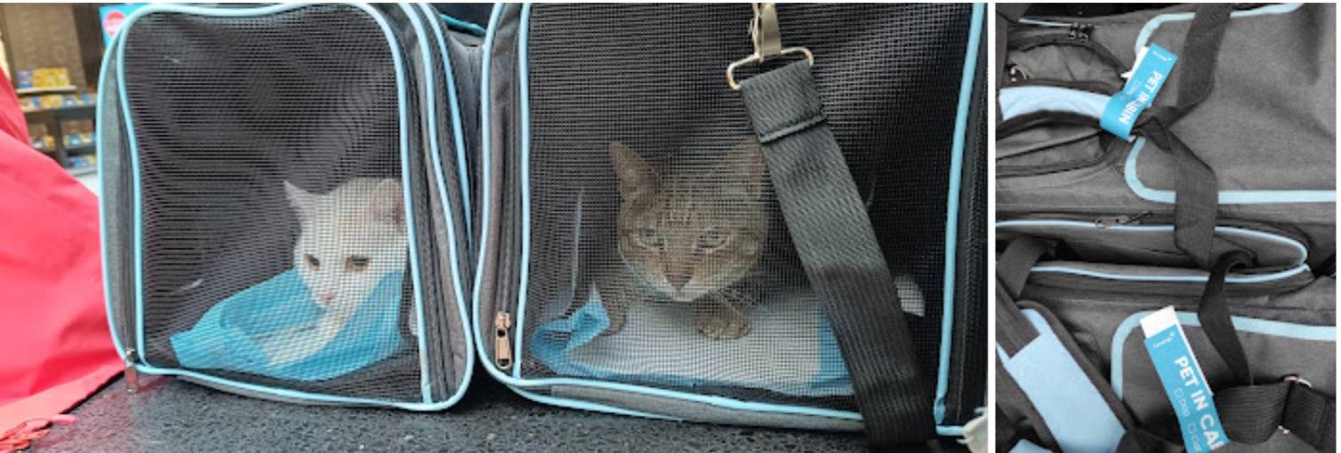 We vinden het vooral spannend omdat we onze katten bij ons hebben: ze moeten urenlang in hun reismand zitten, terwijl ze reizen per auto, vliegtuig en weer in een auto. Hoe zal dat gaan? Op het vliegveld beleven we een spannend moment: we weten dat ze uit hun reismand moeten bij de securitycheck, we hebben ze daarom immers een harnas plus riem om gedaan, zodat we een extra houvast hebben mochten ze ervandoor willen gaan. Maar nu moet het harnas ook uit… Of het is door de stress, of dat het kalmeringsmiddel dat ze hebben gekregen bij vertrek uit het Kattenhotel z’n werk doet: beide heren blijven rustig en komen zonder problemen door de securitycheck en weer terug in hun reismanden. We moeten er echt bij zeggen dat de medewerkers bijzonder vriendelijk en behulpzaam waren en we naar een apart gelegen controlepunt waren gestuurd; dus al met al behoorlijk relaxed.