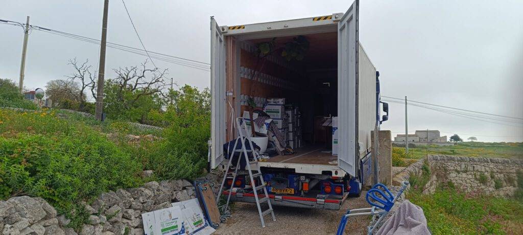Als de dag nadert waarop de verhuiswagen komt om onze inboedel op te halen, slaat de paniek toe: gaan we het echt wel redden om alles op tijd ingepakt te hebben? En hebben we eigenlijk wel genoeg verhuisdozen? Nou, de hulp van onze kinderen de dag voor de verhuizing zorgt ervoor dat we niet de laatste nacht hoeven door te werken, maar dozen komen we wel tekort. Als op vrijdag 28 maart tegen het middaguur de verhuiswagen komt voorrijden, gaan wij als de wiedeweerga aan de slag met het in elkaar vouwen en vullen van de extra verhuisdozen. Ondertussen zijn de 5 verhuizers als een supergeolied team ons huis aan het ‘leegtrekken’ (verhuizerstaal, ha,ha). Tegen 16 uur zit alles in de verhuiscontainer en zien we onze inboedel vertrekken richting Sicilië!